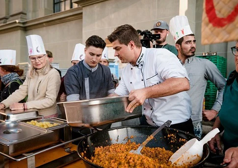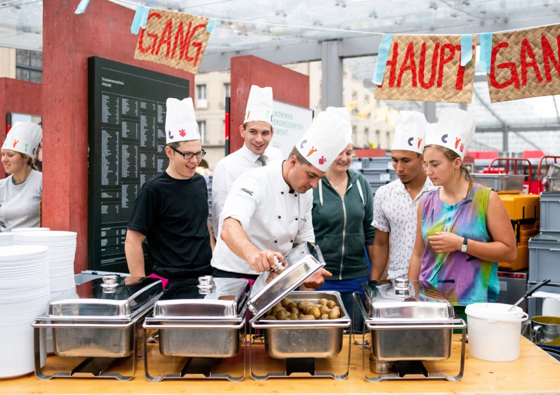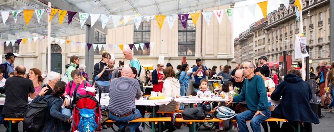 Angeleitet von Profiköchen bereiteten rund 200 freiwillige Helferinnen und Helfer aus über einer Tonne unverkäuflicher Kartoffeln, Tomaten, Gurken, Karotten und Linsen ein feines Menu zu und bewirteten damit 2000 Passantinnen und Passanten. Die Gäste durften an langen Tischen unter freiem Himmel Platz nehmen und die kulinarischen Leckerbissen gratis geniessen. Organisiert wurde das vierte Berner Foodsave-Bankett federführend von foodwaste.ch, von der Offenen Kirche Bern, der Ökonomischen Gemeinnützigen Gesellschaft Bern und von Brot für alle, mitgetragen von rund 30 weiteren Partnern – darunter auch von der SV Stiftung.